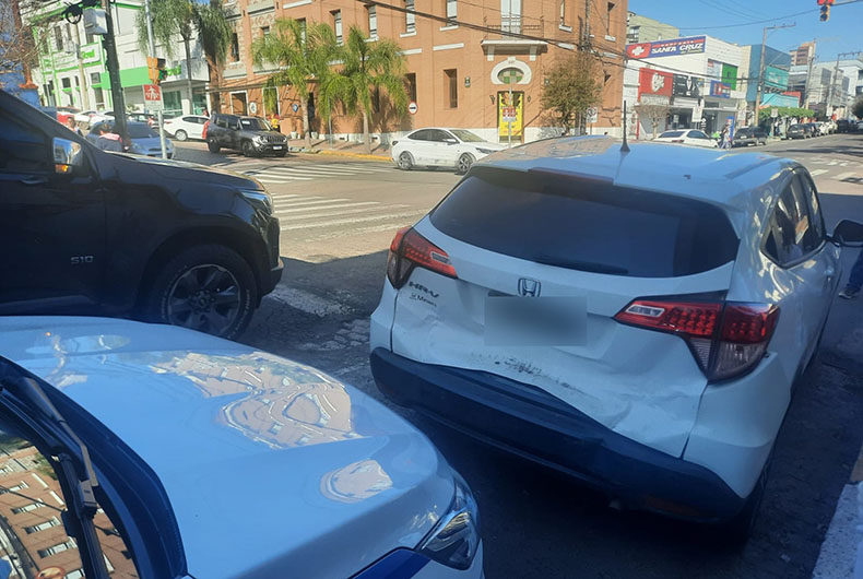 Um ônibus de treinamento de direção do 14° Batalhã da Polícia Militar (BPM), da Região das Missões, atingiu dois veículos, na altura do semáforo na esquina das Ruas Tenente Coronel Brito e Ramiro Barcelos, no início da tarde desta terça-feira, 4. Os instrutores vieram ministrar curso de direção para policiais do Vale do Rio Pardo.