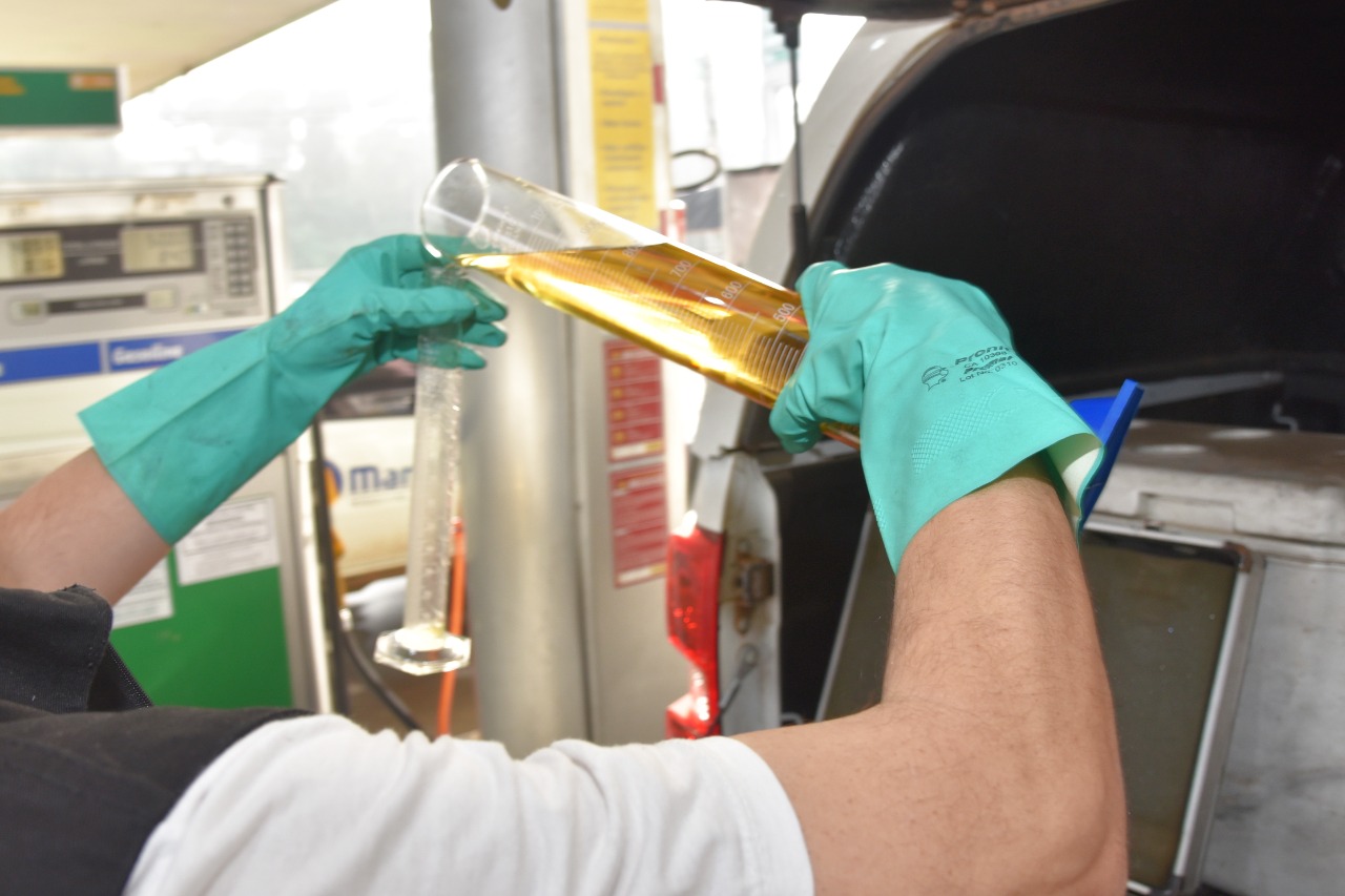 Dentre elas, é verificado pelo fiscal da ANP o teste de volume vazão das bombas. Já em relação à qualidade do combustível, o primeiro teste é o visual. Diesel, gasolina e etanol não devem estar turvos e nem conter impurezas. Depois, a fiscalização realiza também o teste da proveta, que indica se o percentual de etanol anidro na gasolina está correto.