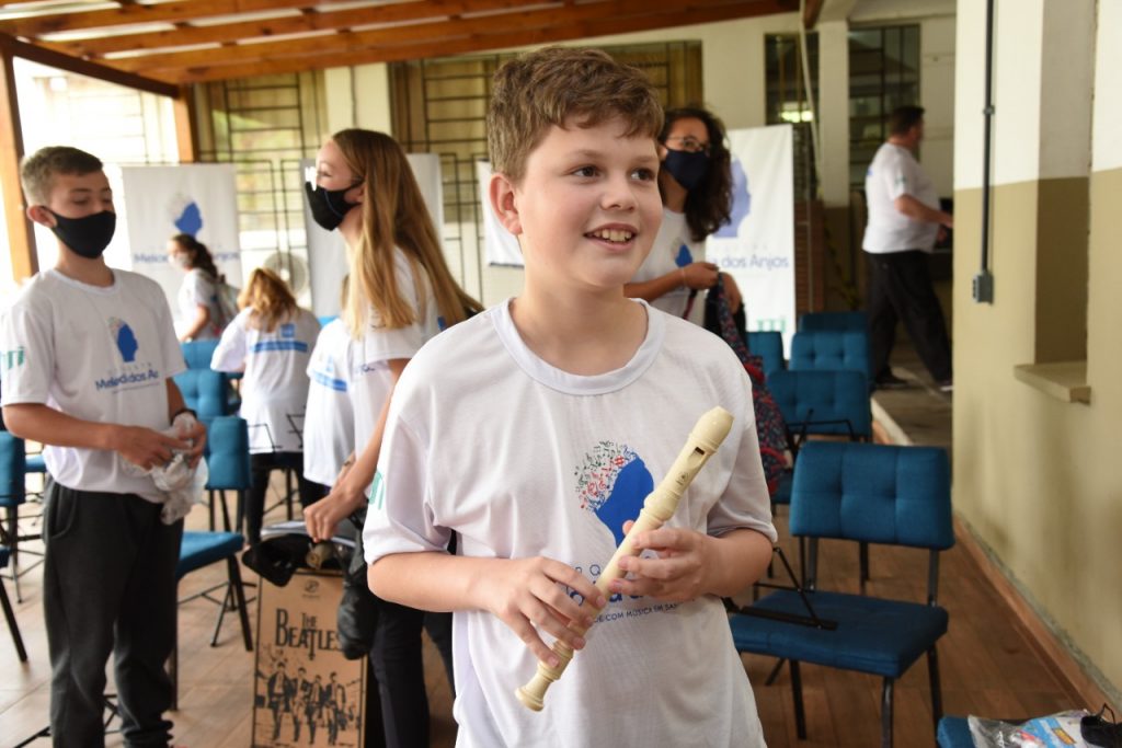 Nesta primeira apresentação, o grupo tocou duas canções: O sino da Capela, de Mário Mascarenhas, e um trecho da 9ª Sinfonia de Beethoven. “Me sinto feliz que consegui aprender e já me apresentar”, disse o garoto Vitor Gabriel, de 13 anos, e aluno do 7º ano, que já compreendeu também os benefícios de participar da iniciativa. “Música é divertido. Assim eu fico menos tempo no celular”, relatou.