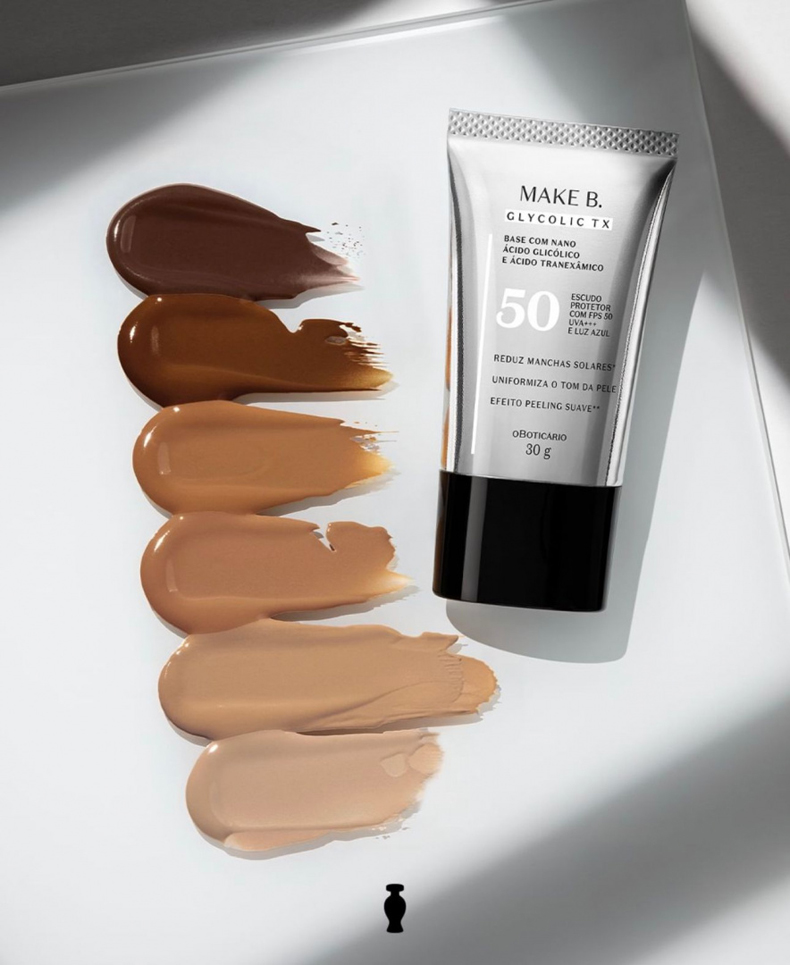 A Make B., marca de maquiagem do Boticário, lançou a primeira base do mundo capaz de reduzir manchas solares. É a Make B. Glycolic TX, que leva nano ácido glicólico e ácido tranexâmico na fórmula. A expectativa é de um resultado gradativo, em até oito semanas de uso contínuo, de uniformização da pele, eliminando manchas causadas pela exposição ao sol e outras marcas escurecidas.