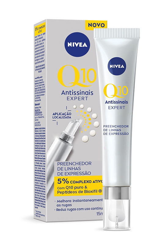 A Nivea apresenta o Q10 Antissinais Expert, que diminui rugas e linhas de expressão em cinco minutos. O produto age como um preenchedor, mas sem interferir no processo natural de envelhecimento da pele. A fórmula é enriquecida com ácido hialurônico e creatina, que penetram profundamente na pele e alcançam até a décima camada. Além disso, estimula a produção de colágeno e previne o aparecimento de novas rugas. O novo produto está à venda com preço sugerido de R$ 99,00.