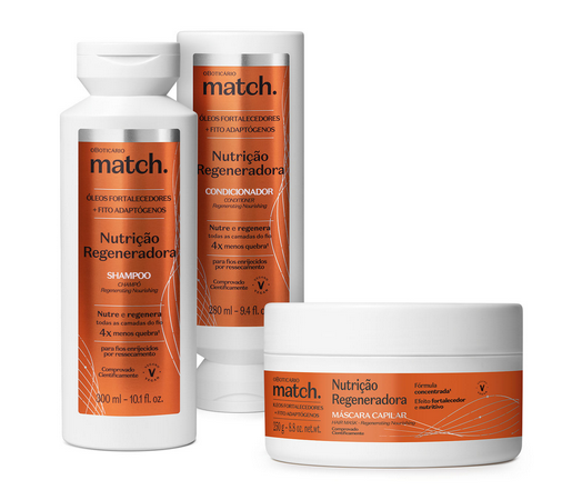 Match, a marca de cabelos de O Boticário, ampliou o portfólio com o lançamento de Match Nutrição Regeneradora, uma linha que deixa os fios quatro vezes mais fortes. Trata-se de shampoo, condicionador e máscara, que agem, principalmente, nos cabelos que estão rígidos e secos. o combo custa R$ 151,70. A ação acontece desde o córtex capilar, com a reposição de aminoácidos, passando por todas as camadas dos fios.