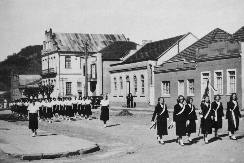 De lá, a jovem Lya seguiria pela Rua Marechal Floriano acima, e em questão de poucos metros estaria no Colégio Visconde de Mauá. Curiosamente, quase sete décadas depois, exemplares do jornal estudantil que Lya ajudou a elaborar estão recolhidos ao Arquivo Histórico que funciona exatamente no mesmo ambiente. Maria Luiza recorda que o prédio de dois andares da esquina da Floriano com a Borges de Medeiros, no qual hoje está a Iluminura, no térreo, havia sido concluído há pouco no início da década de 1950. “Aquela construção foi inaugurada em 1949”, refere, com o auditório no segundo andar, ampliando a estrutura das salas da escola que se estendia ao longo da Borges de Medeiros. No interior da quadra ficava o amplo espaço de recreio, ainda existente aos fundos do Museu. Uma foto da época mostra Lya em destaque à frente de um grupo de estudantes em desfile por ruas da cidade.