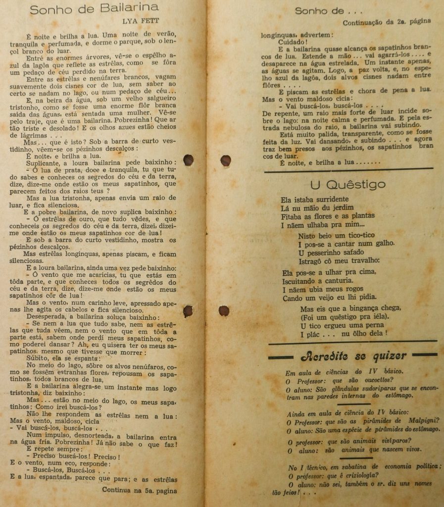 O Estudante na verdade era o “quinzenário” do Grêmio Cívico-Literário José de Alencar, no Colégio Visconde de Mauá, atual Colégio Mauá. Quem zela pelas preciosidades daquelas publicações é a diretora do Museu do Colégio Mauá, professora Maria Luiza Schuster. O acervo está no prédio da Rua Marechal Floriano, na frente da Praça da Bandeira e do prédio da Prefeitura. Ali, na década de 1950, quando a jovem Lya estudava, era justamente a sede do colégio. Ela era filha de Arthur Germano Fett, professor e depois fundador do Curso de Direito na cidade, e de Wally Neumann Fett. A família residia a duas quadras do educandário, na esquina das ruas Marechal Floriano com Galvão Costa, no no 415 que hoje corresponde à sede do Sindicato Interestadual da Indústria do Tabaco (SindiTabaco).