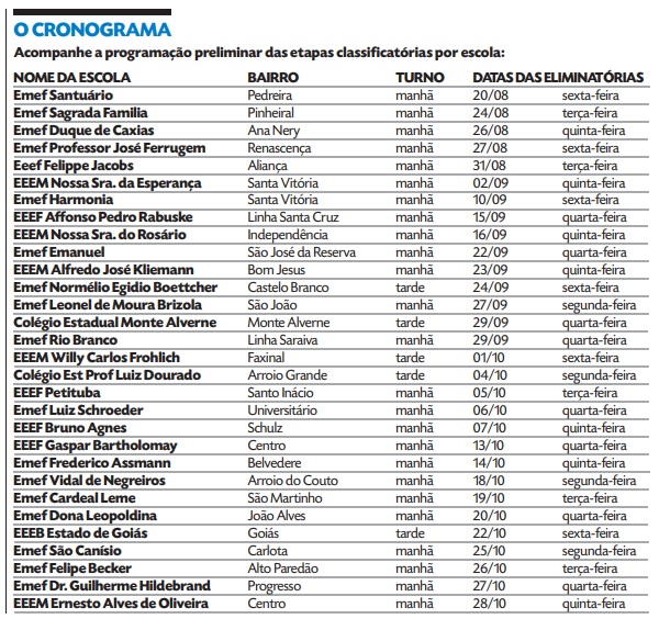 A competição contará com questões divididas em quatro áreas de conhecimento: Ciências Humanas, Ciências da Natureza, Linguagens e Matemática, incluindo as questões com temas transversais como bullying; discriminação racial e sexual; drogadição e inclusão social. Conforme o diretor de Eventos da Gazeta Grupo de Comunicações, Edson Marques, o cronograma de datas está em fase de desenvolvimento e segue de acordo com as datas escolhidas pela maioria das instituições.