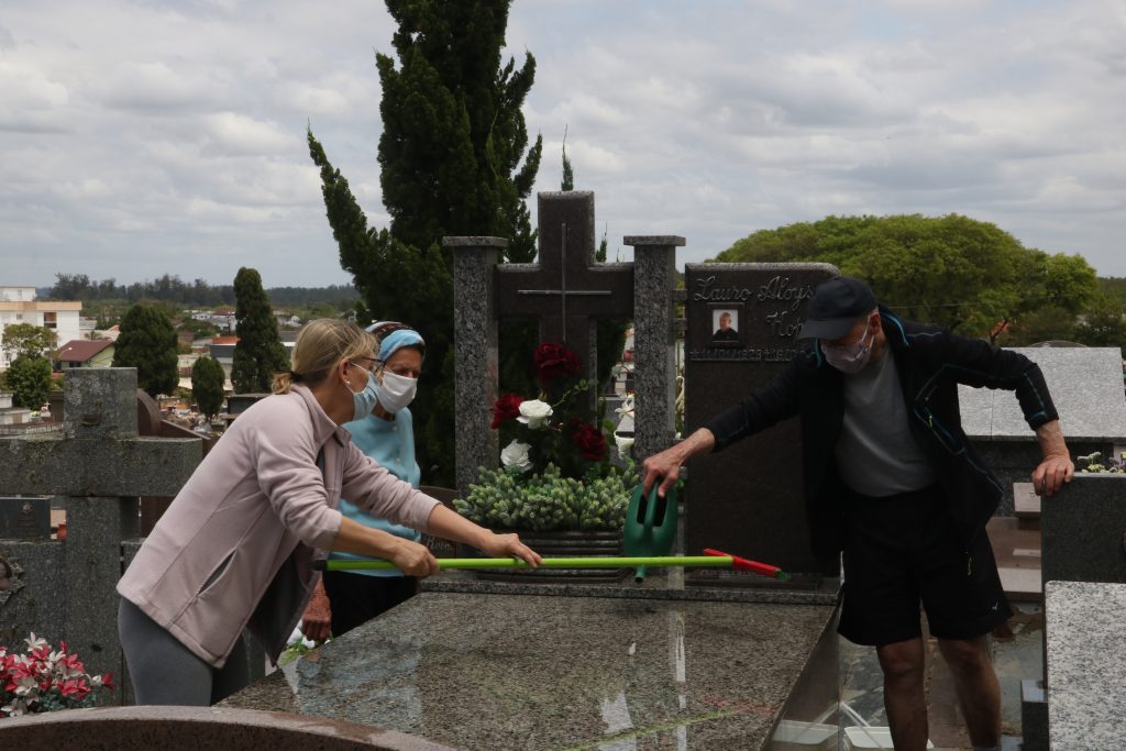 O dia de Finados, nesta segunda-feira, 2, deverá levar centenas de pessoas aos cemitérios de Santa Cruz do Sul. Somente no Municipal, o maior deles, são esperados em torno de 6,7 mil visitantes. No entanto, com as restrições e protocolos da pandemia do novo coronavírus, muita gente optou por seguir as orientações e evitar aglomerações. Com isso, muitos se anteciparam e fizeram suas homenagens e orações ainda no sábado. Foi o caso da empresária Áurea Binz, de 60 anos, que durante a manhã, acompanhada do marido Paulo Binz, 69, e da mãe Ingrid Kops, de 87, aproveitou para limpar e levar flores ao túmulo do pai, que está sepultado no Cemitério Municipal.
