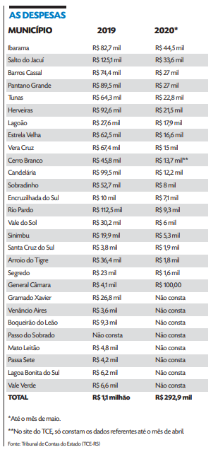 Oito câmaras não registraram nenhuma despesa com viagens neste ano – Gramado Xavier, Venâncio Aires, Boqueirão do Leão, Passo do Sobrado, Mato Leitão, Passa Sete, Lagoa Bonita do Sul e Vale Verde. Já o Legislativo de Santa Cruz do Sul, maior município da região, gastou apenas R$ 1,9 mil.