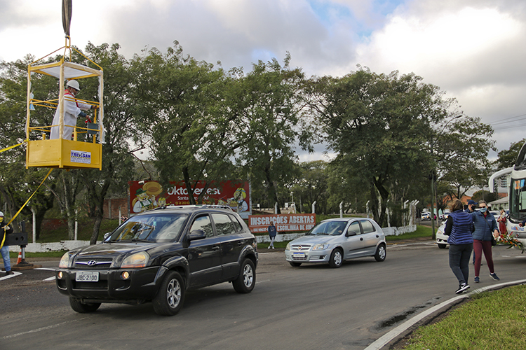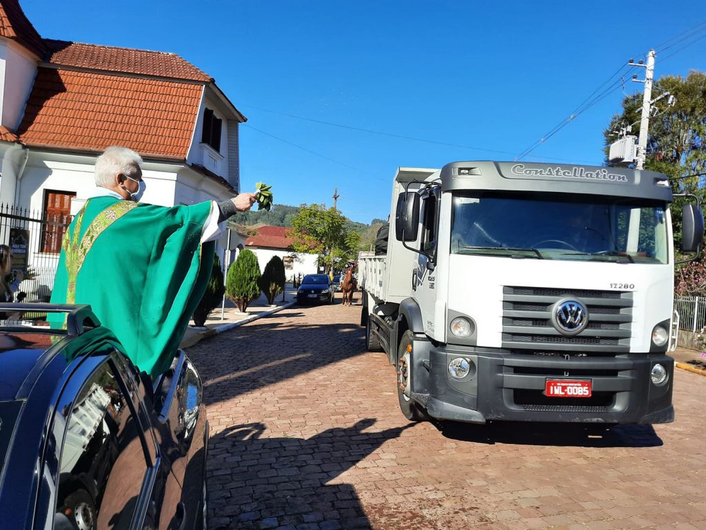 Na sequência, às 9h30, uma carreata percorreu as ruas da localidade e passou em frente à paróquia, na Rua Doutor Pedro Eggler, onde o padre Eleutério Orsolin abençoou os veículos e passageiros. A celebração, entretanto, precisou ser adaptada em virtude dos protocolos de distanciamento social impostos pela pandemia. O costumeiro baile da tarde no salão paroquial foi cancelado.