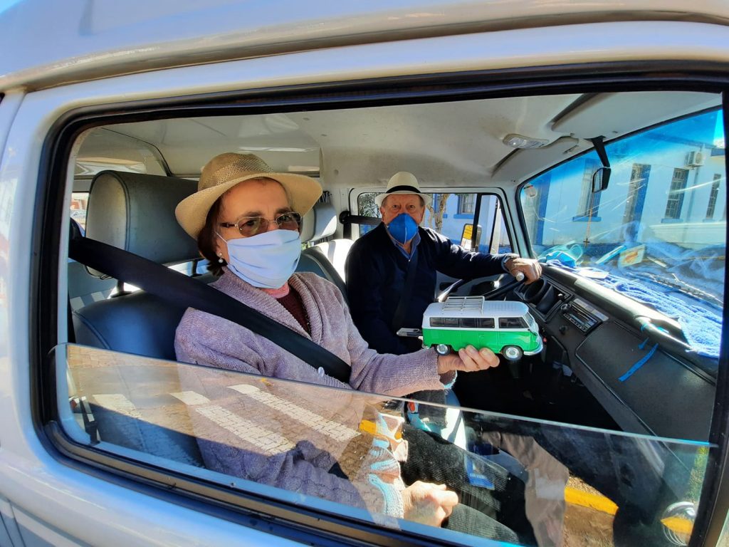 Modificada e com uma placa de táxi na parte de cima, o veículo transportava seu Astor Elmo Selzler, de 75 anos, e dona Asta Mohr Selzler, de 73. Com o braço para o lado de fora, a caroneira trazia uma miniatura da mesma Kombi em que estavam trafegando, e que se revelou uma caixa de som, tocando os principais hits das bandinhas de alemão. “Queremos a benção do padre para o nosso veículo, para a miniatura e para a gente”, disse dona Asta. O casal bem humorado também revelou ser fiel à celebração. “Participamos todos os anos e nos faz bem”, disse Astor, que trabalha com táxi desde 1987, além de possuir lavouras de verduras junto à residência da família, em Linha Saraiva.