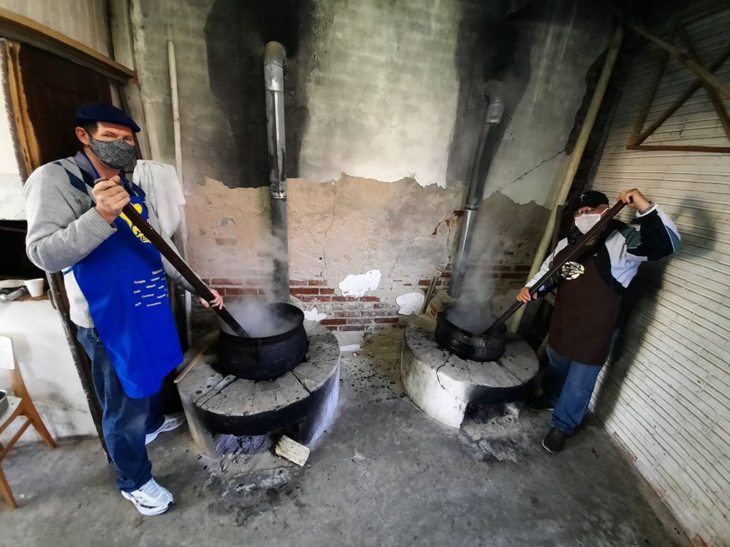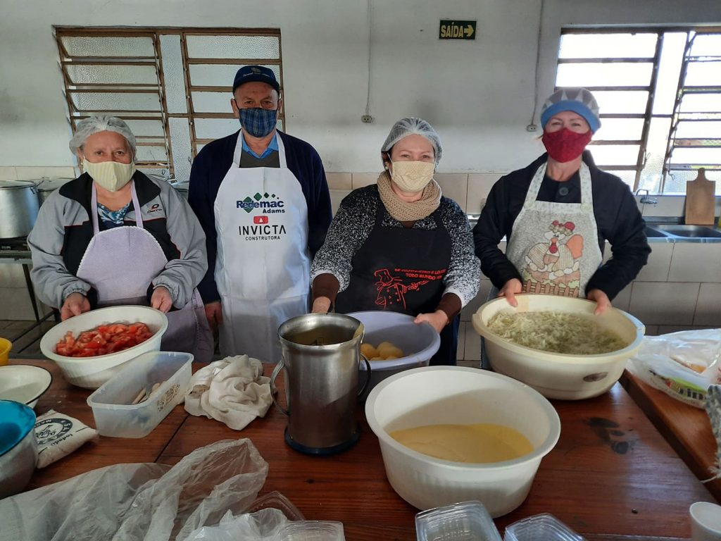 O almoço no salão comunitário, realizado normalmente após a carreata, ganhou um formato diferente. Com aglomerações proibidas, o jeito foi seguir a tendência recente e adotar o formato drive-thru para distribuir a também tradicional galinhada com maionese. “Temos espaço aqui para fazer seis panelas de galinhada, que servem 480 refeições. É uma tradição de antigamente, dos nossos antepassados e que a gente mantém”, relata Irineu Dupont, um dos responsáveis pela cozinha. Ele conta que preparar comida e, sobretudo, comida boa para tanta gente, não é tarefa fácil, mas a experiência adquirida ao longo dos anos ajuda.