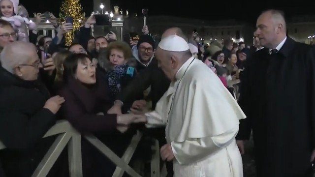 A mulher estava atrás das barreiras de segurança, como os outros fiéis, e puxou repentinamente o papa Francisco quando ele se aproximou. O pontífice deu tapas na mão da mulher e se retirou cercado pelos seguranças.