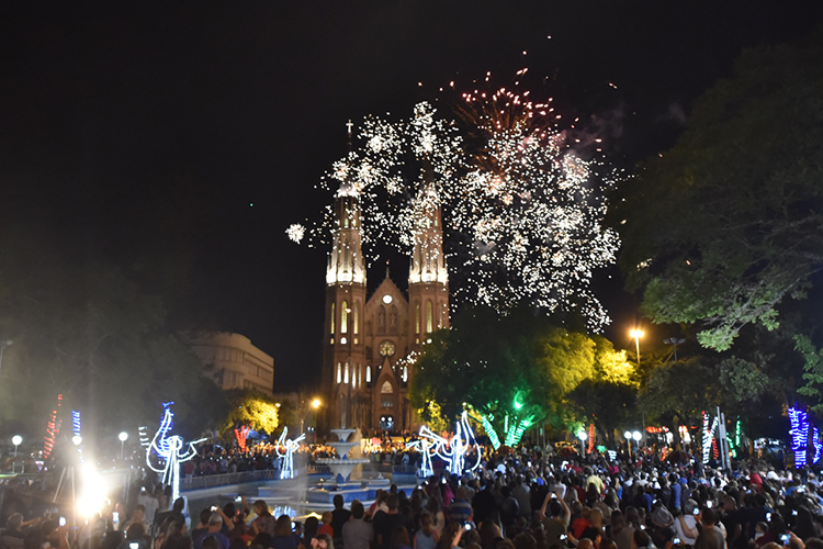 Papai Noel chegou discreto no palco, desejando a todos muita saúde, paz e amor neste Natal. Enquanto falava, começaram fogos, pois na Catedral São João Batista ocorria um casamento. “Estes fogos não são os meus, os meus serão mais bonitos ho-ho-ho”, disse o bom velhinho. Em seguida, os fogos começaram a explodir novamente, agora, eram os do senhor Noel. “Esta é uma festa de paz, solidariedade e amizade em Santa Cruz”, disse o presidente da Associação de Entidades Empresariais de Santa Cruz do Sul (Assemp), Léo Schwingel.