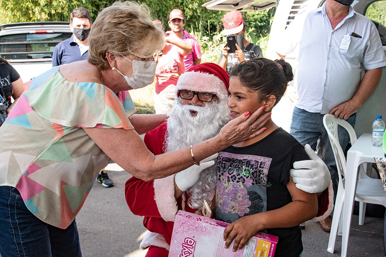 A prefeitura de Santa Cruz do Sul levou o Papai Noel até o Loteamento Santa Maria na tarde de sábado, 4. A visita integrou a programação da Feira da Cidadania, ação da administração municipal em parceria com a Unisc, na localidade. Durante o evento, na rua Professor Léo Winterle, houve entrega de brinquedos às crianças do bairro. Ao lado do Bom Velhinho, a prefeita Helena Hermany auxiliou na distribuição dos presentes.