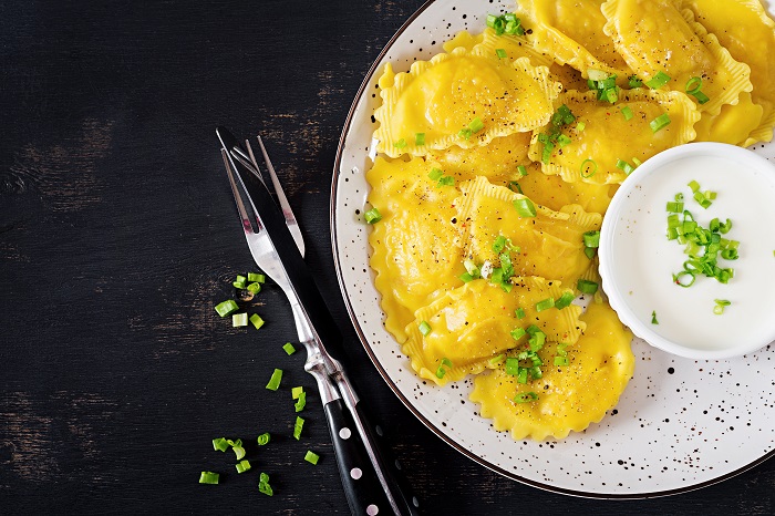 Ravioli with spinach and ricotta cheese. Italian cuisine. Top view