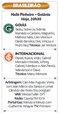 Em grande fase sob o comando do técnico Mano Menezes, o Internacional quer entrar de vez na briga pela liderança. Para isso precisará passar pelo Goiás. O jogo será nesta quarta-feira, às 20h30, no Estádio Hailé Pinheiro (Serrinha). E é válido pela 12ª rodada do Brasileirão.