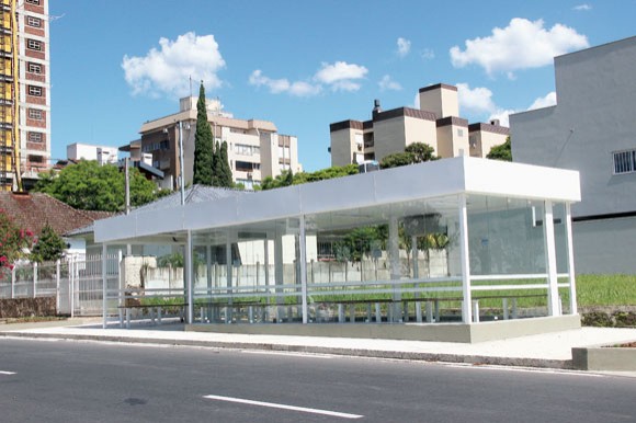 A curiosidade da população de Santa Cruz em torno da nova parada de ônibus da Rua Tiradentes só aumenta na medida em que o terminal vai ganhando forma. Trata-se de um novo padrão de abrigos que a Prefeitura está testando no local, com uma estrutura coberta, envidraçada e parcialmente fechada e climatizada.