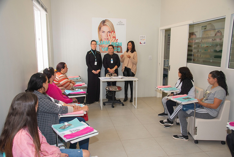 Além de não pagarem, as alunas recebem todo o material para as aulas. Neste primeiro encontro, já foram entregues bolsas, toalhas, alicates e apostilas. No decorrer do curso, conforme forem acontecendo as aulas práticas, elas irão receber os demais utensílios necessários para desenvolverem as tarefas. O curso será semanal, com duração de cinco meses, e tem fila de espera para suplentes que aguardam vaga em casos de desistências.