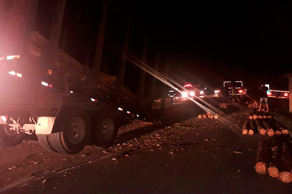 Um caminhão bitrem carregado de toras de madeira teve a carga espalhada na RSC-287 na noite desta segunda-feira, 16, em Venâncio Aires. Segundo informações preliminares, parte do reboque, com placas de Santa Rosa de Viterbo – São Paulo, teria se desprendido, provocando a queda da carga sobre a rodovia.