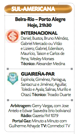 Em caso de novo tropeço, o futuro do treinador no Beira-Rio será colocado em xeque. Na primeira rodada do Grupo E, o Internacional ficou no 2 a 2 com o 9 de Outubro-EQU, no Equador, e o Guaireña-PAR também somou um ponto ao empatar com o Independiente Medellín-COL, por 3 a 3, na Colômbia.