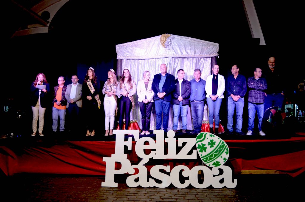 Com o tema “Educar e transformar”, a Páscoa deste ano agrega celebrações religiosas e eventos gerais, os quais seguem até 23 de abril. Na solenidade de abertura estiveram presentes o prefeito Armando Mayerhofer e a primeira-dama Vani Mayerhofer, vice-prefeito e secretário de Educação, Cultura, Turismo e Desportos, Ivan Trevisan, secretário da Indústria, Comércio e Serviços e coordenador das festividades, Darlan Kittel, demais secretários municipais, diretora de Cultura e Turismo, Ingrid Hermes, soberanas do município, comunidade e imprensa. “Ficamos muito felizes com a presença da comunidade. Nos motiva a pensarmos em mais eventos para abrilhantar ainda mais a nossa região”, destacou o secretário Darlan, agradecendo a participação da população e o trabalho de todos para realizar produções que movimentam a cultura e turismo no município.