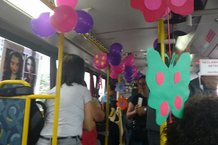 Quando o ônibus passava pela Avenida Brasil, parou e a homenageada embarcou juntamente com suas mãe e filha. Era uma jovem de 23 anos que vende café no logradouro e é conhecida de todos. Quando um dos passageiros descobriu que ela estava grávida, combinaram a celebração.