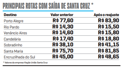 Entre as principais rotas com saída de Santa Cruz está Venâncio Aires. Destino diário de muitas pessoas, atualmente o trecho até a Capital do Chimarrão, pela Stadtbus, custa R$ 11,05 pela estrada nova e R$ 12,95 pela estrada velha. Com o aumento, a passagem passa a custar R$ 11,90 pela estrada nova e R$ 15,90 pela estrada velha. O valor é sem seguro.