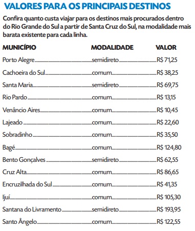 Houve mudanças ainda na tarifa mínima para embarque nas estações rodoviárias, que passou para R$ 8,00 na modalidade comum e R$ 9,40 na semidireta e direta. Para a executiva, 1,3 vezes o índice da direta, e para a leito, duas vezes índice do tipo comum.