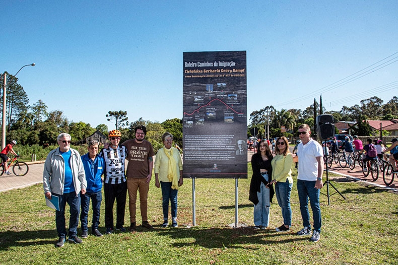 A comunidade de Linha Santa Cruz teve um momento de nostalgia na tarde deste sábado, 24. Um de seus mais antigos moradores, já falecido, foi homenageado por cerca de 350 ciclistas, e inclusive com placa instalada no mesmo local onde um dia nasceu e viveu. Trata-se de Gerhard Georg Kampf, um nome agora eternizado na ciclofaixa da localidade, por ter contribuído muito para o desenvolvimento de Santa Cruz do Sul, em especial nos anos 1960.