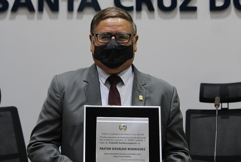 A Câmara de Vereadores realizou sessão solene na última quarta-feira, 2, para a entrega do título de Cidadão Santa-cruzense ao pastor Osvaldo Rodrigues, numa iniciativa do vereador Cléber Pereira (DEM).