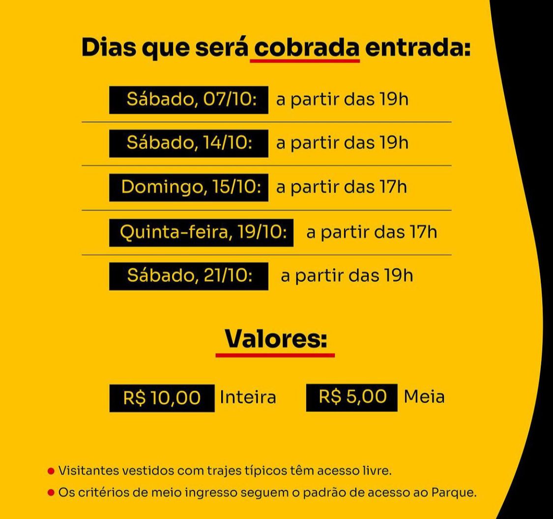 Um dos pontos mais tradicionais da Festa da Alegria terá datas e horários com cobrança de ingresso para acesso. É Pavilhão Central do Parque da Oktoberfest. O custo será de R$ 10 (inteira) e R$ 5 (meia). Conforme a organização do evento, a cobrança será feita por meio do Oktober Karte, cartão que também será usado para compra de bebidas e alimentação na 38ª Oktoberfest.