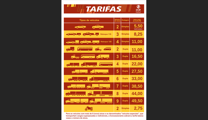 Desde a meia-noite desta quinta-feira, 29, estão em vigor os novos valores das tarifas de pedágio em todas as praças da concessão da CCR ViaSul, no Rio Grande do Sul. O reajuste anual é previsto em contrato de concessão com base nos índices inflacionários (IPCA) e no cumprimento de diretrizes contratuais. A alteração será praticada em todas as sete praças ao longo das quatro rodovias administradas pela Concessionária. Dessa forma, o valor, que era de R$ 5,80 no caso de carros, por exemplo, passará para R$ 5,50.