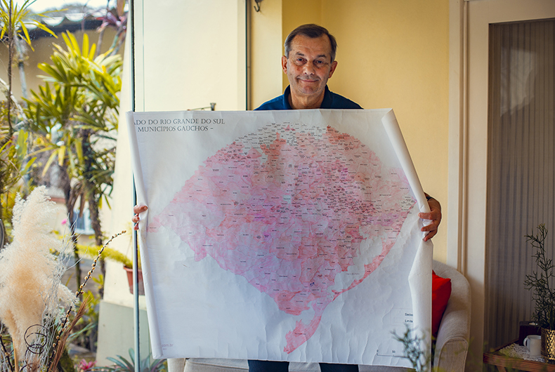Natural de Santo Antônio da Patrulha, há dois anos residindo em Santa Cruz do Sul, Larri não se engana nos cálculos. Faltam apenas 18 municípios para visitar e, assim, completar o mapa gaúcho. Na companhia da mulher, a professora de História aposentada Suzema Bittencourt Gomes, já percorreu cerca de 20 mil quilômetros em visitas a 479 municípios. As viagens ocorrem a cada 30 ou 40 dias. “Pegamos a estrada e ficamos passeando por quatro ou cinco dias”, conta o viajante.
