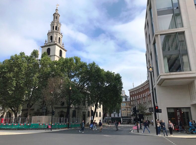 Uma fotografia atual que oferece perspectiva do mesmo local na capital do Reino Unido