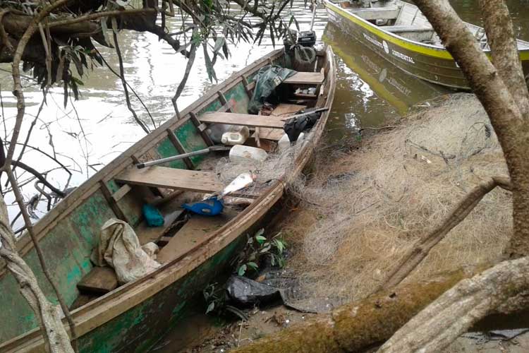 Ele abandonou um barco artesanal de madeira, um motor de rabeta, 450 metros de redes e uma caixa plástica que continha 49 peixes da espécie cascudo. Os policiais perseguiram o homem, mas ele não foi encontrado. O material de pesca foi apreendido e os animais, devolvidos ao rio.