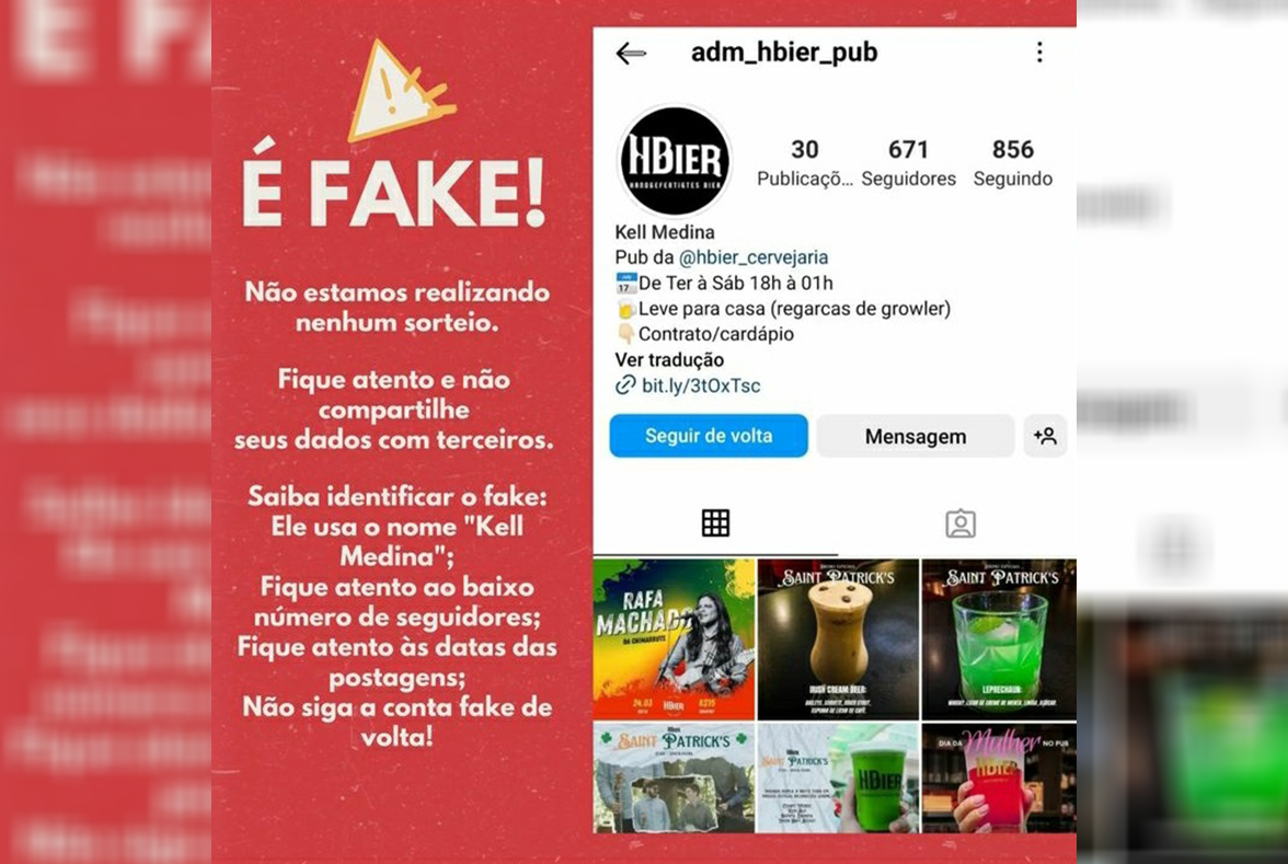 A ideia é que não sejam reverberadas informações falsas, mas também serve como alerta para golpes, como o que está sendo aplicado em nome de cervejarias de Santa Cruz. Uma delas é a HBier. Perfil falso no Instagram tem divulgado falsas promoções. A casa alerta para que sejam observados os números de seguidores dos perfis e as datas de postagens.