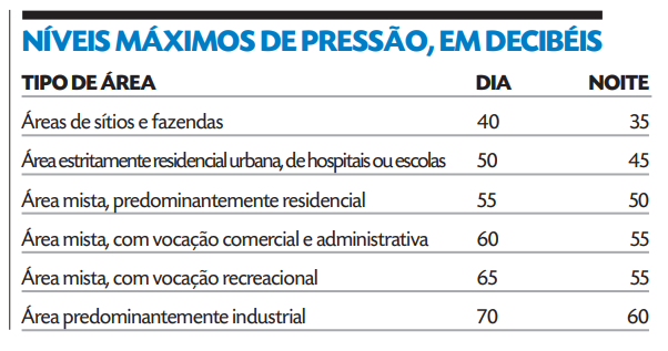 Os limites são diferenciados por zonas e também por turno (confira na tabela abaixo) e utilizam o decibel (dB) como unidade de intensidade física relativa do som como parâmetro, na curva de ponderação A, conforme norma da Agência Brasileira de Normas Técnicas (ABNT).