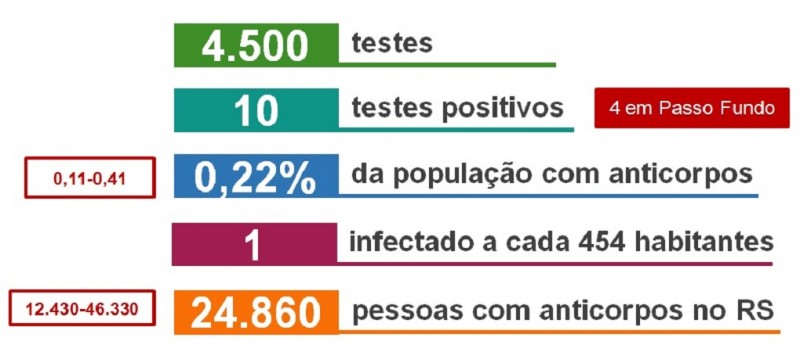 Dos 4,5 mil testes rápidos aplicados entre os dias 9 e 11 de maio, 10 pessoas testaram positivo. Destas, quatro foram em Passo Fundo, município que vem apresentando números de casos e mortes elevados nas estatísticas oficiais. Os outros foram em Ijuí (2), Caxias do Sul (1), Pelotas (1), Porto Alegre (1) e Santa Cruz do Sul (1). Completam a lista de cidades onde a pesquisa foi feita Canoas, Santa Maria e Uruguaiana. Juntos, os nove municípios representam 31% da população gaúcha.