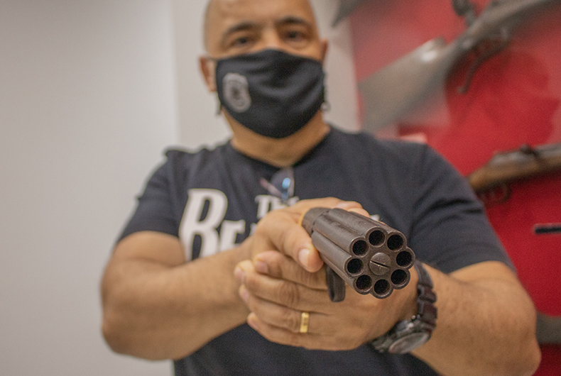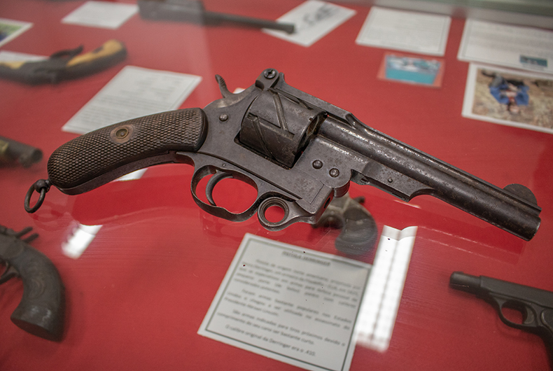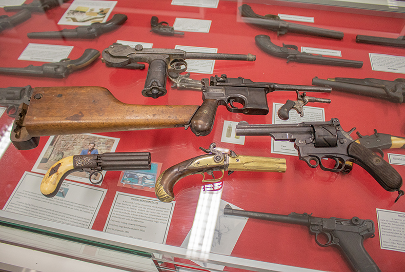 Outra relíquia é o revólver pimenteiro “pepper-box”. Arma curta usada para defesa pessoal no século 19, possui oito canos em torno de um eixo, que podiam ser disparados uma só vez ou em série. Um dos exemplares curiosos nas galerias é a pistola semiautomática Mauser C-96. Entre suas características, estão o depósito interno de munições na frente do gatilho, o cano longo e a coronha de madeira, que pode ser utilizada como coldre para guardar a arma.