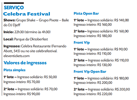 Os ingressos podem ser adquiridos no Celebra Restaurante, na Rua Fernando Abott, 545, no Centro, ou pelo site celebrafestival.eleventickets.com. Os tíquetes disponíveis são Pista, Pista Open Bar, Front Vip e Front Vip Open Bar.
