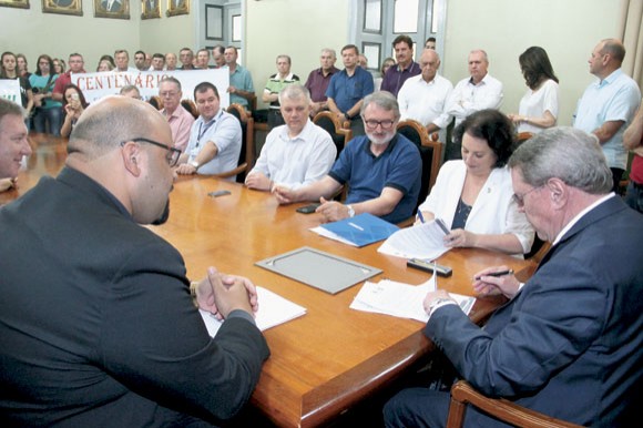 A atualização do Plano Municipal de Saneamento Básico ganha uma nova parceira. Em cerimônia realizada na manhã dessa sexta-feira, a Universidade de Santa Cruz do Sul (Unisc) firmou contrato com a Prefeitura e assegurou concentrar esforços para aprimorar os sistemas de abastecimento de água, esgotamento sanitário e drenagem urbana. Construção da nova Estação de Tratamento de Água (ETA), soluções de esgoto para Linha Santa Cruz e Linha João Alves e localização de novos reservatórios para minimizar os transtornos do desabastecimento estão entre os pontos a serem investigados pelos técnicos do Núcleo de Gestão Pública da instituição.