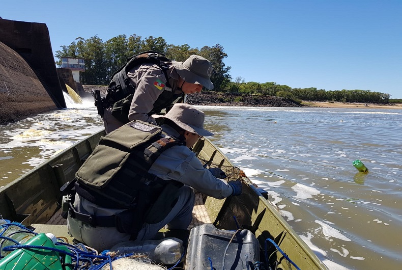 Durante a ação, em patrulhamento embarcado pelo Rio Jacuí, foram flagrados cerca de 250 metros de redes de pesca ancorados na estrutura da Barragem do Anel de Dom Marco. O material foi retirado das águas, apreendido e recolhido ao depósito do 2º GPMA, em Rio Pardo. Os responsáveis pelos petrechos apreendidos não foram identificados.