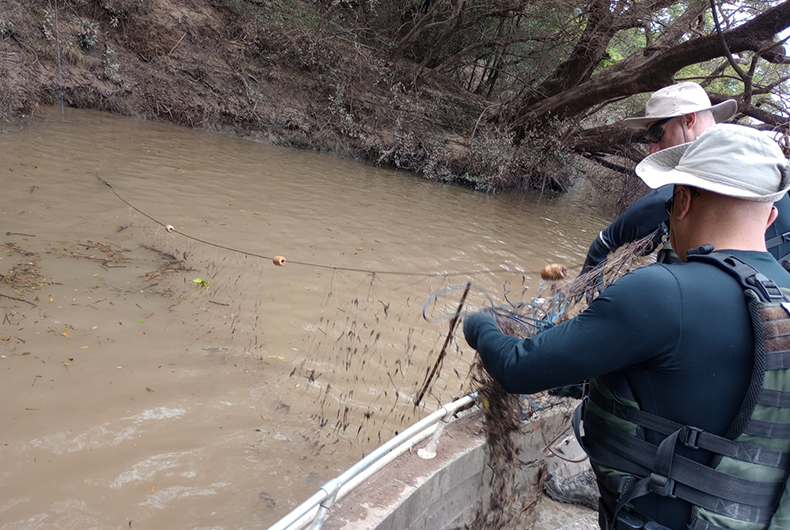 Durante o patrulhamento foram retiradas do ambiente aquático três redes de pesca, totalizando aproximadamente 150 metros. Não foi possível localizar os proprietários do material.
