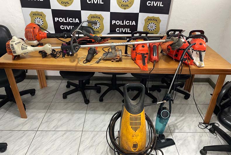 Entre os itens apreendidos na casa do homem, estão três motosserras, duas roçadeiras, aparador de cerca viva, aspirador de pó, lava jato, serra mármore, serra circular, máquina de cortar cabelo, aparelho de babyliss, escova elétrica e chapinha de cabelo.