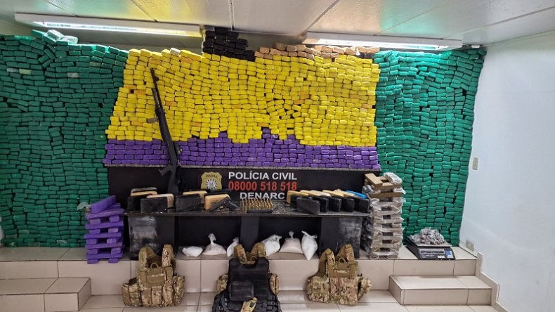 Durante diligências, ao chegar no local, os policiais localizaram um contêiner com 1.090 quilos de maconha, 17 quilos de cocaína, 11 quilos de crack, uma arma, calibre. 12, semiautomática, munições, balanças de precisão, embalagens, insumos e petrechos para refino e preparação de droga, além de 4 coletes balísticos, dois veículos e celulares.