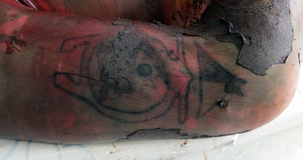 Uma tatuagem no bíceps direito, entre o ombro e o cotovelo, é uma das únicas evidências encontradas. A pista pode ser a chave para esclarecer quem é o indivíduo. “Por isso, divulgamos a imagem, para que, se alguém fizer reconhecimento, entrar em contato conosco”, complementou Lisandra.