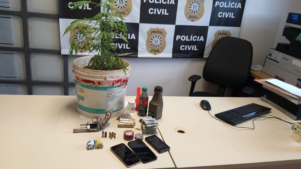 Nos locais foram encontrados um pé de maconha; porções da mesma droga, que totalizaram cerca de 50 gramas; um revólver calibre 32; munições para a mesma arma; além de cerca de R$ 500,00 em dinheiro e três telefones celulares.