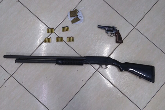 Por volta das 7 horas, os policiais cumpriram um mandado de busca e apreensão na residência no Bairro Progresso. Nela, encontraram 200 gramas de maconha e duas armas: no forro, estava escondida uma espingarda calibre 12 e um revólver calibre 38.