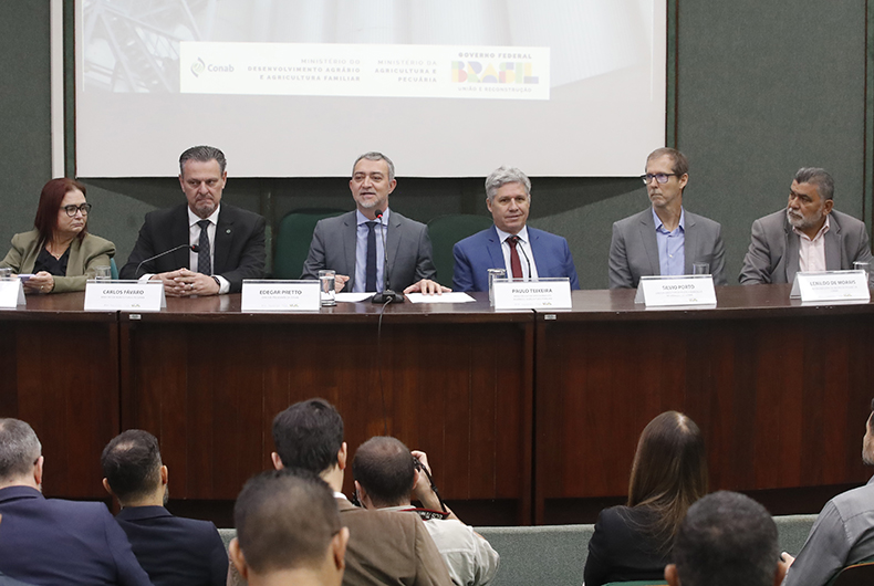 A retomada da formação de estoques públicos pelo governo federal foi anunciada pelos ministros Carlos Fávaro (Agricultura e Pecuária) e Paulo Teixeira (Desenvolvimento Agrário e Agricultura Familiar) e pelo presidente da Conab. Participaram do anúncio os diretores da Companhia, Silvio Porto (Política Agrícola e Informações), Thiago dos Santos (Operações e Abastecimento), Rosa Neide (Administrativa, Financeira e de Fiscalização) e Lenildo de Morais (Gestão de Pessoas).