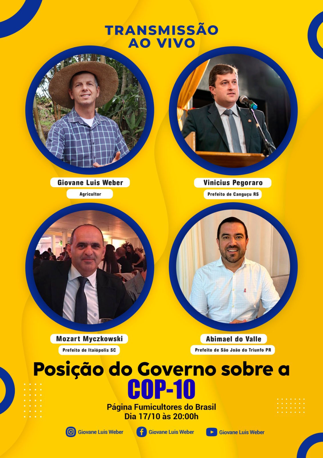 Hoje à noite, a partir das 20 horas, na página Fumicultores do Brasil, farei uma transmissão ao vivo para debater a “Posição do Governo sobre a COP-10”. Meus convidados são três prefeitos: o de Canguçu, Vinicius Pegoraro, que é o município hoje na condição de maior produtor de tabaco do Brasil (e assim, naturalmente, também o maior no Rio Grande do Sul); o de Itaiópolis (SC), Mozart Myczkowski, o maior entre os catarinenses; e o de São João do Triunfo (PR), Abimael do Valle, maior produtor em território paranaense. Com eles, vamos avaliar a forma como o governo brasileiro conduz os preparativos para a 10ª Conferência das Partes (COP-10) da Convenção-Quadro para Controle do Tabaco, que ocorrerá em novembro, no Panamá. Pegoraro é também presidente da Associação dos Municípios Produtores de Tabaco do Brasil (Amprotabaco).