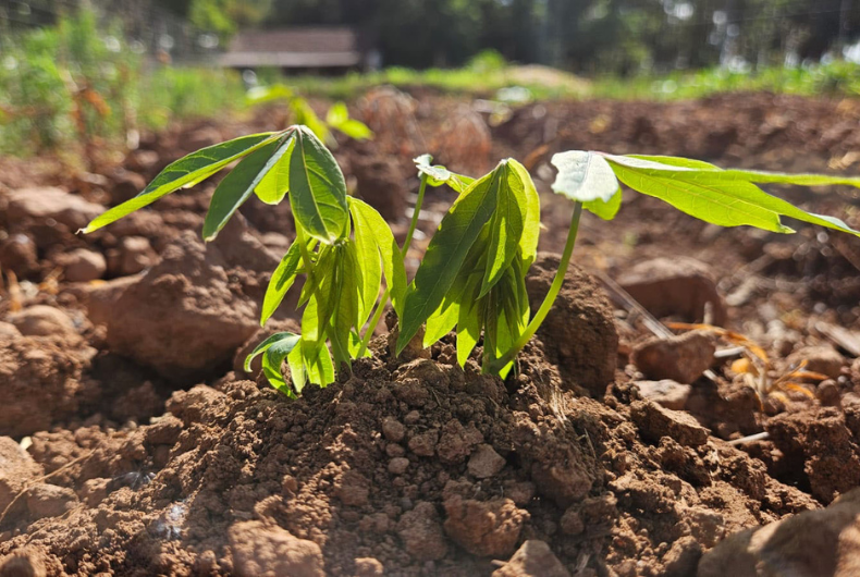 E não é só o tabaco que depende da chuva para prosseguir o seu desenvolvimento. O mesmo vale para o milho e outras culturas já implantadas nas pequenas propriedades da região. É o caso do aipim, que germinou bem, como se pode ver na foto acima, e agora aguarda por umidade para crescer. Do contrário, esses brotos podem até murchar, com o vento frio e a terra seca, e comprometer a safra que os produtores poderiam vir a ter, para a sua subsistência.